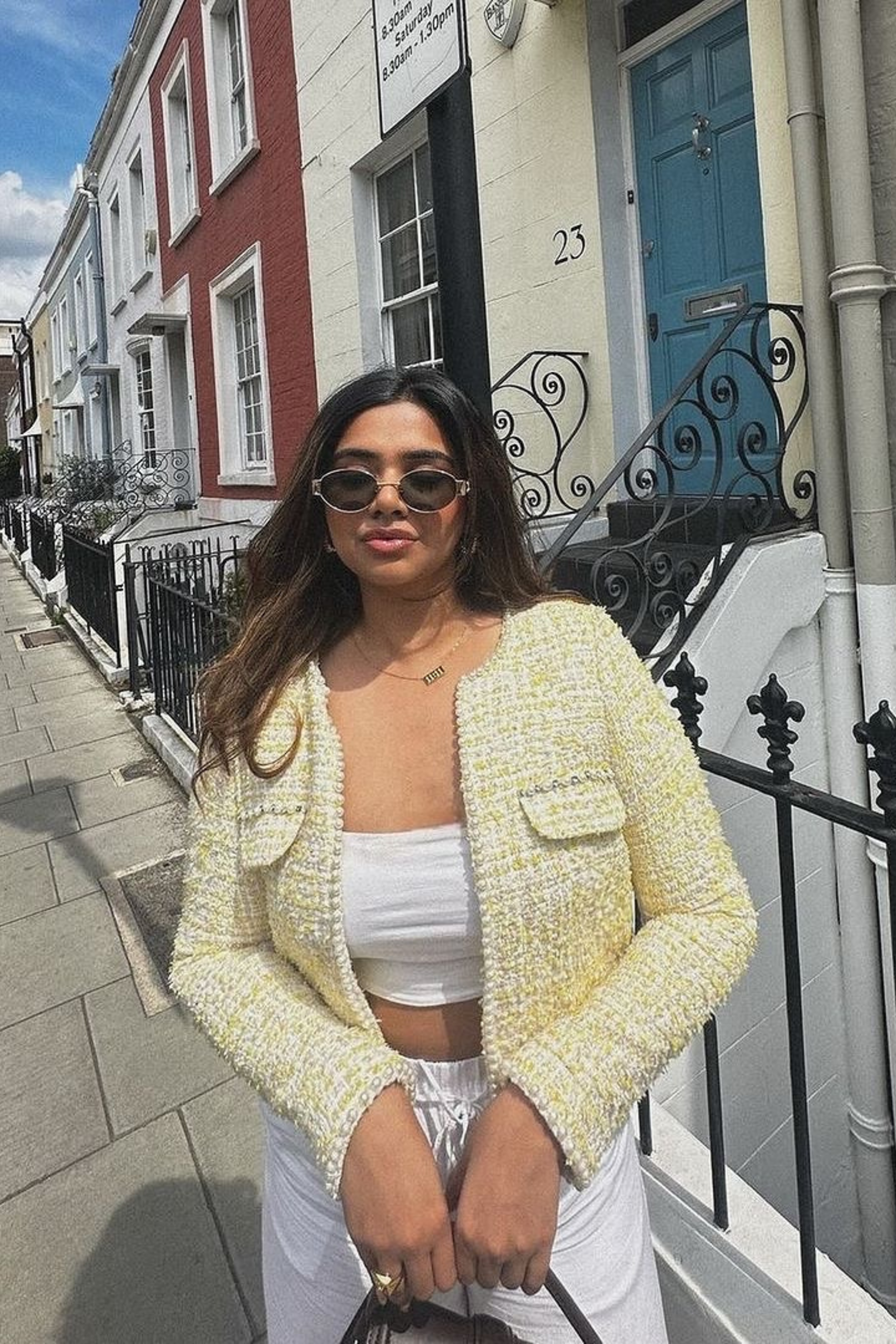 Yellow tweed jacket finished with pearl detailing