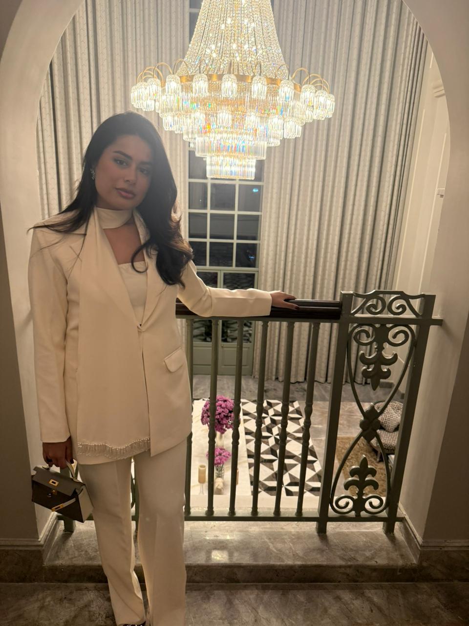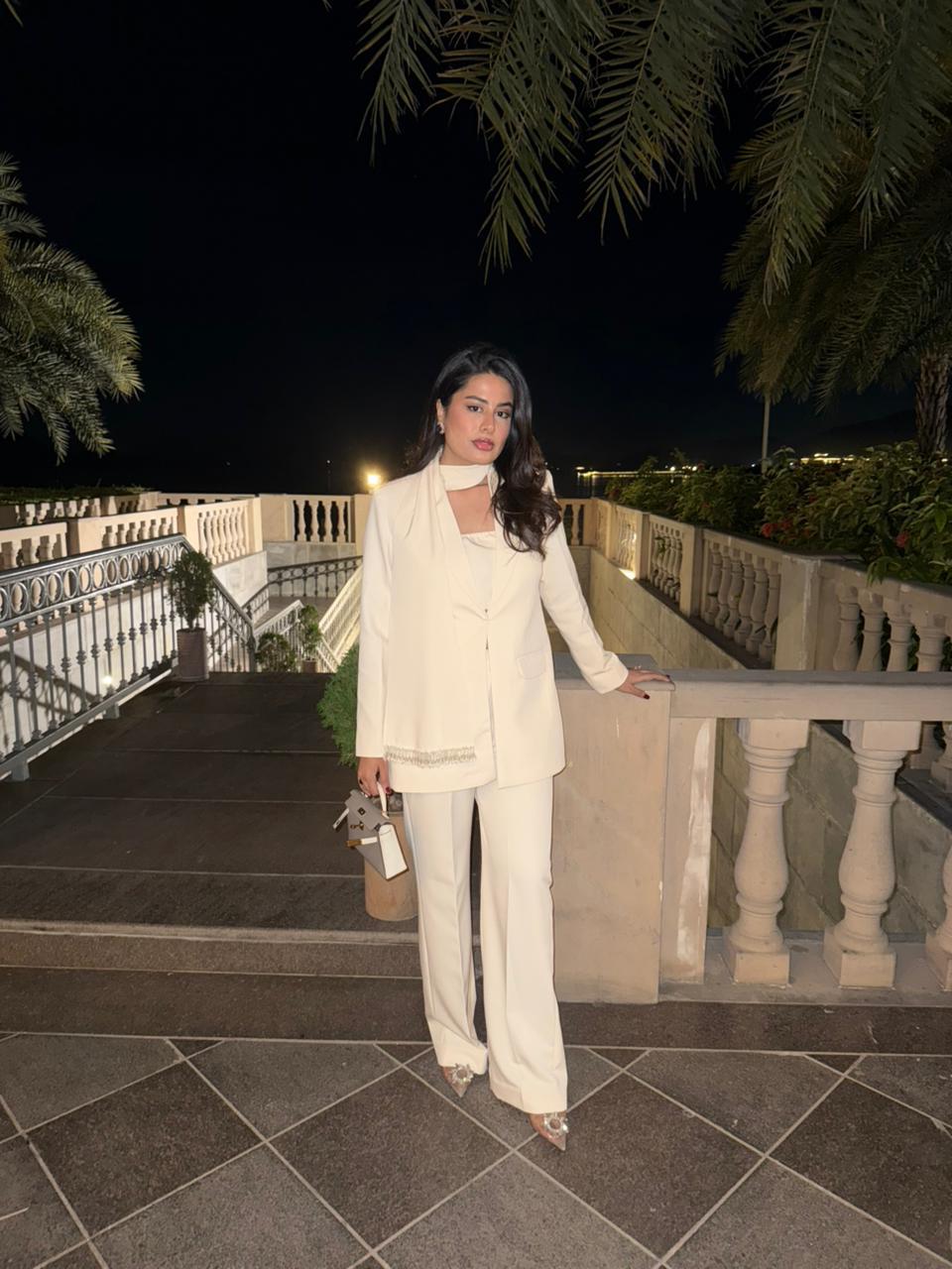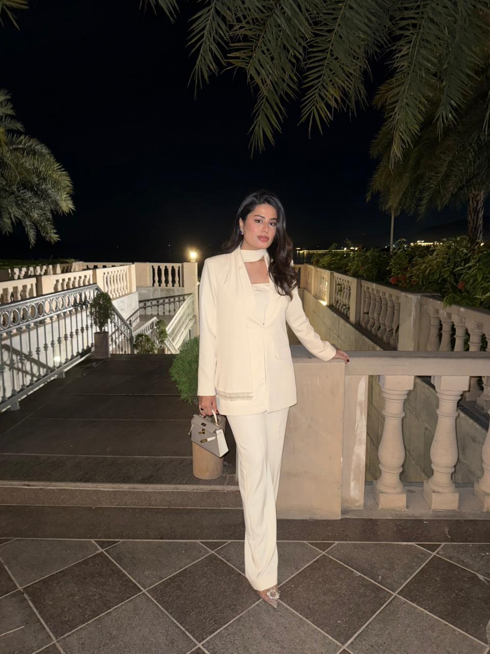 Straight cut blazer, attached scarf finished with Swarovski hangings.
