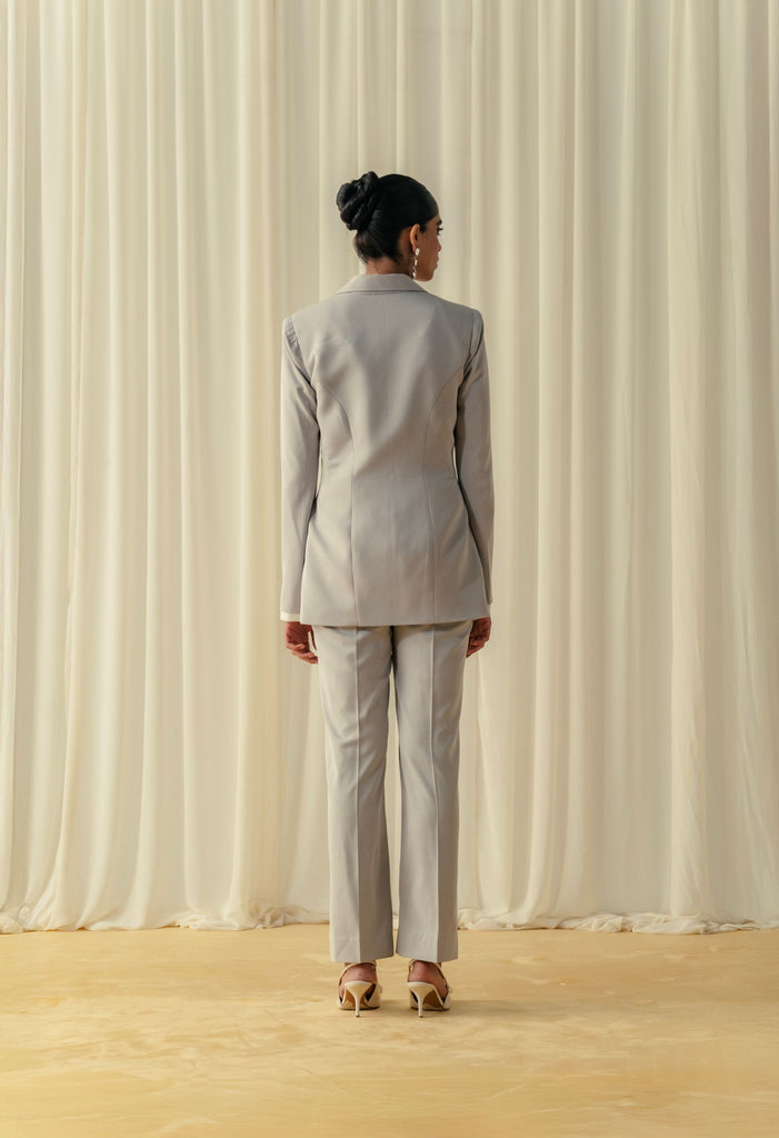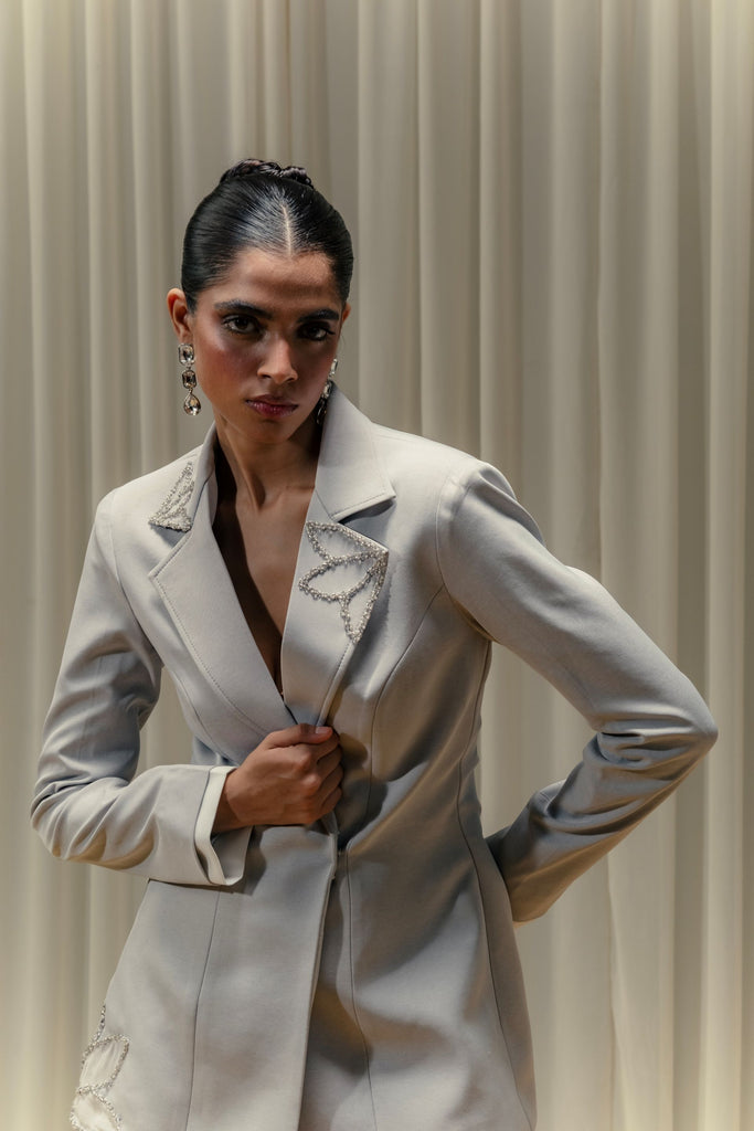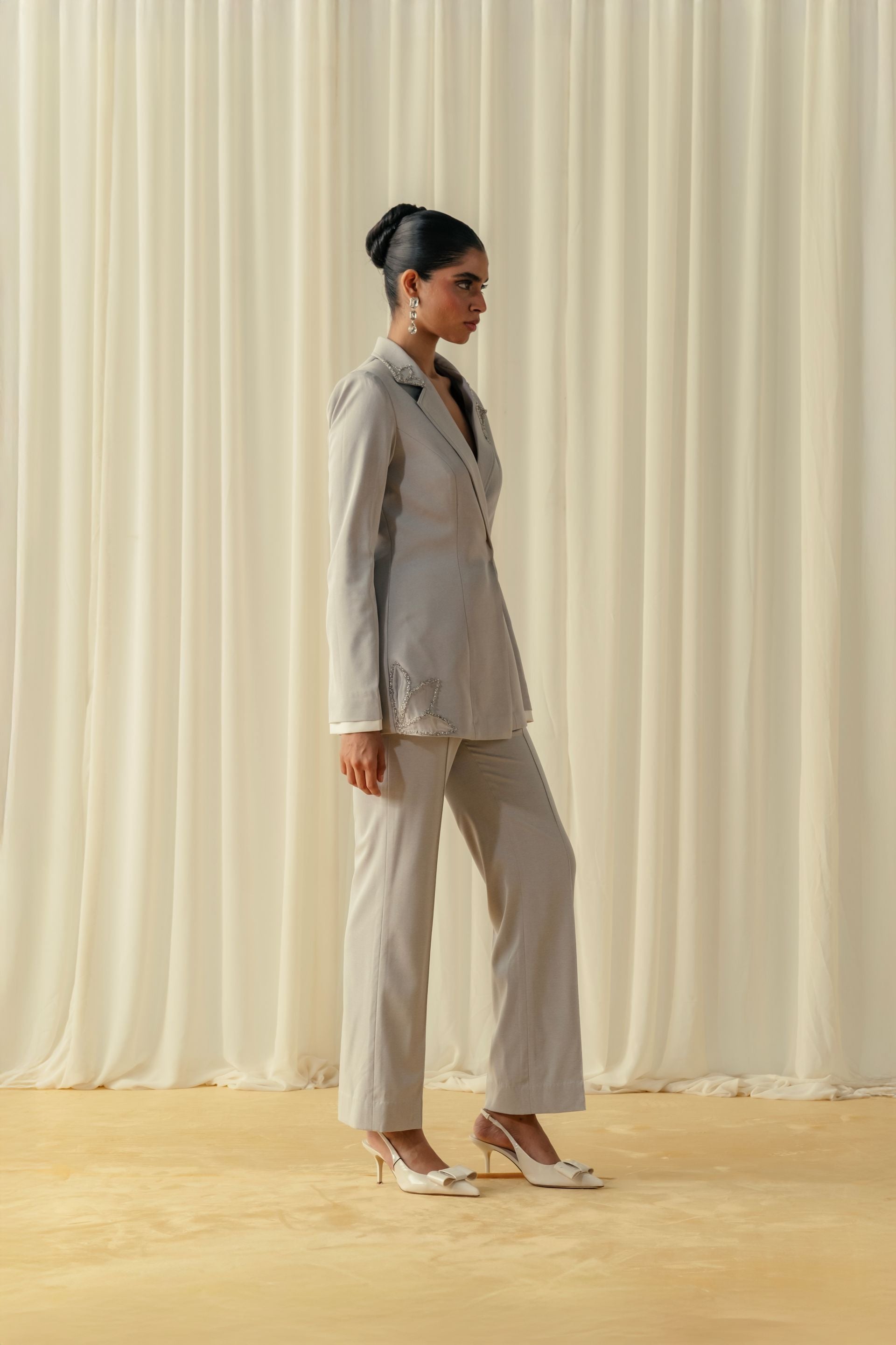 Grey cord set with flower patch on side helm and lappels made with crystals.