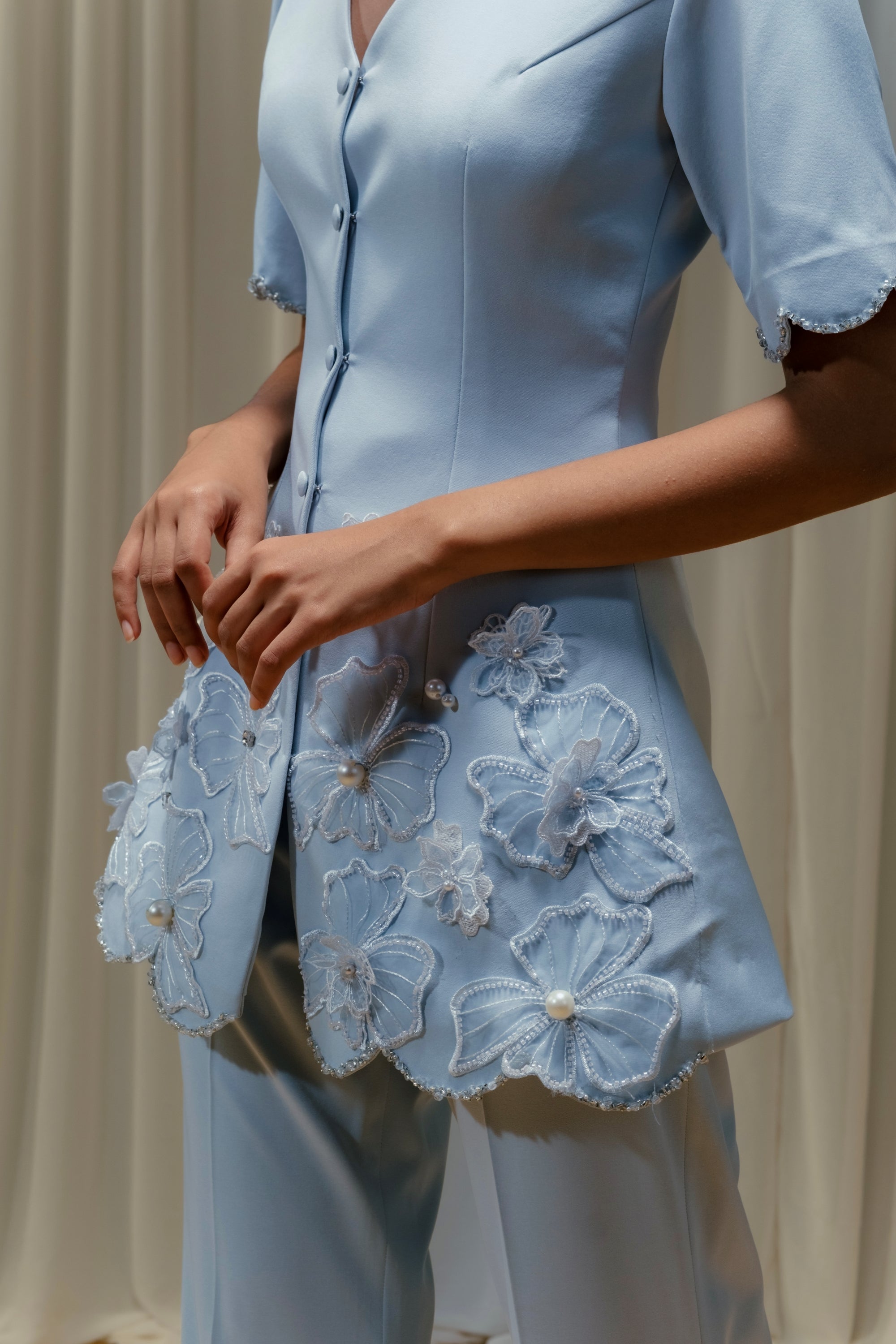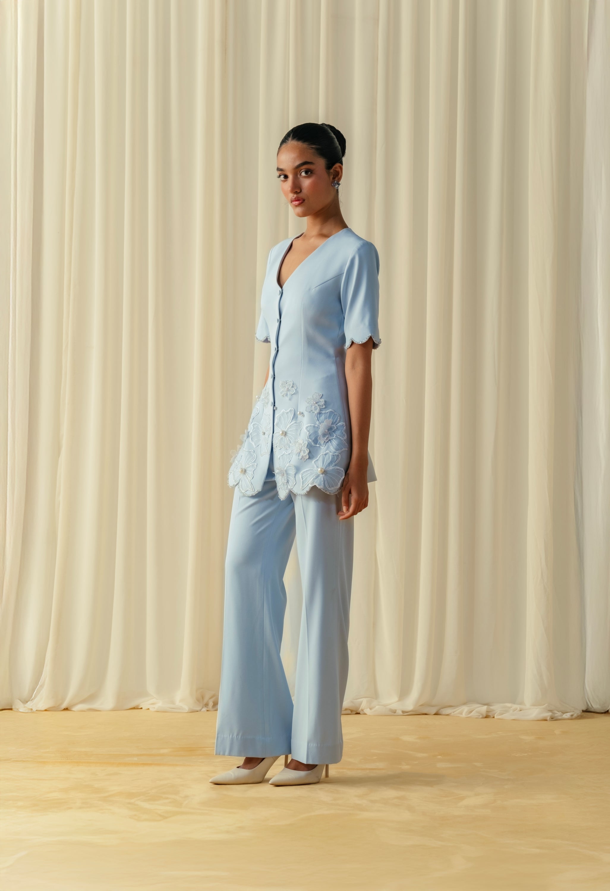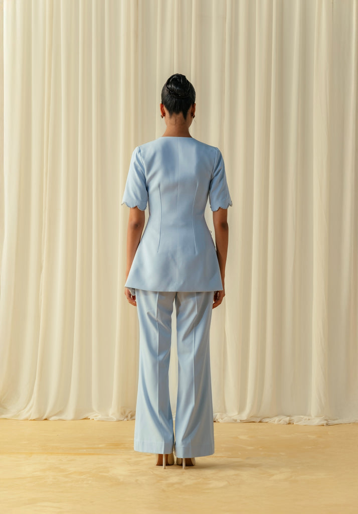 Powder blue cord set with bell bottom pants and scalloped helm. Finished with lazer cut flowers, swaroski and pearl work.
