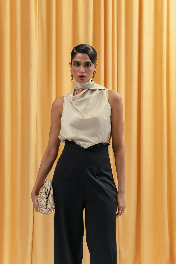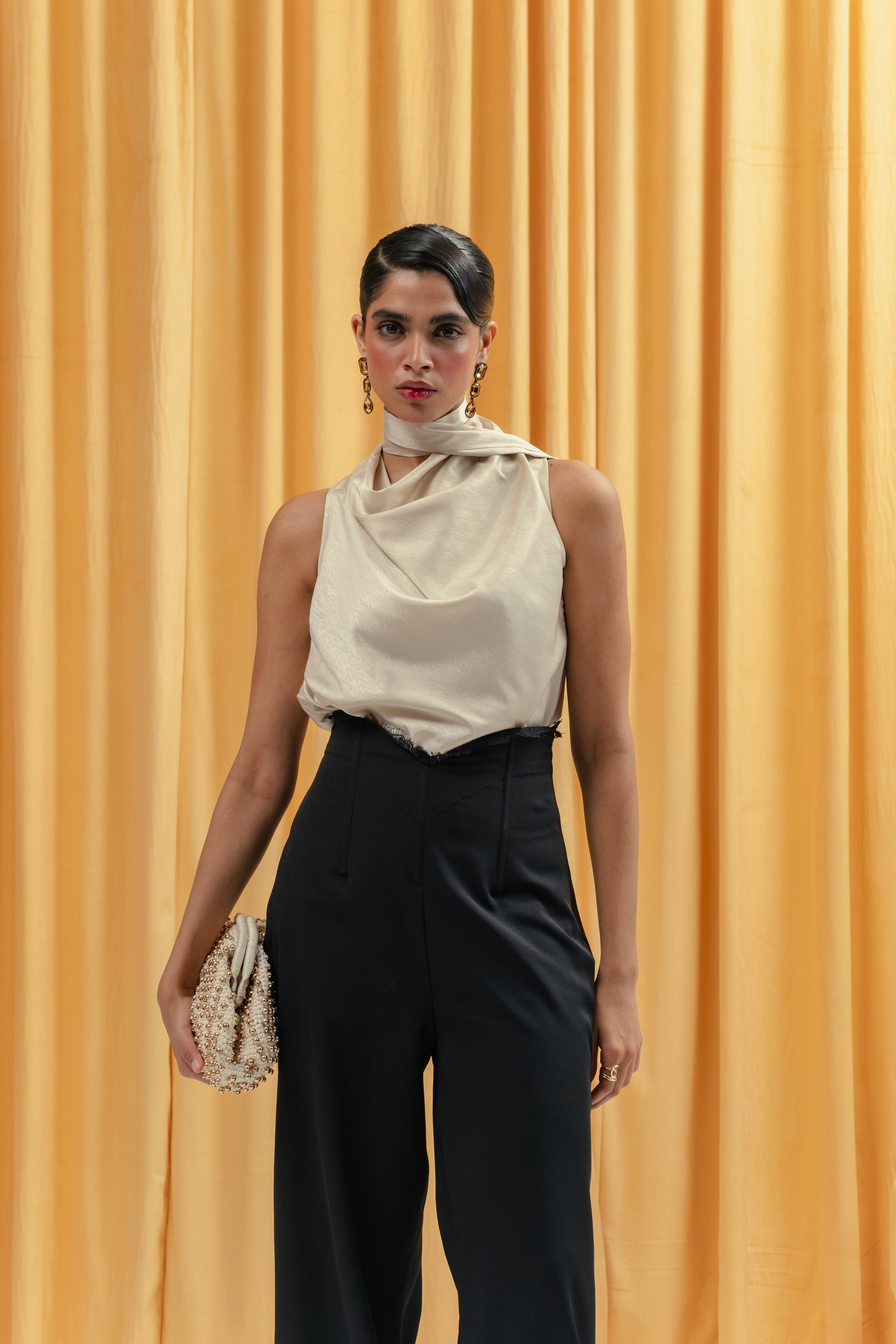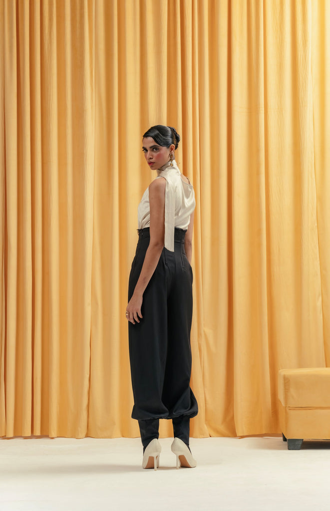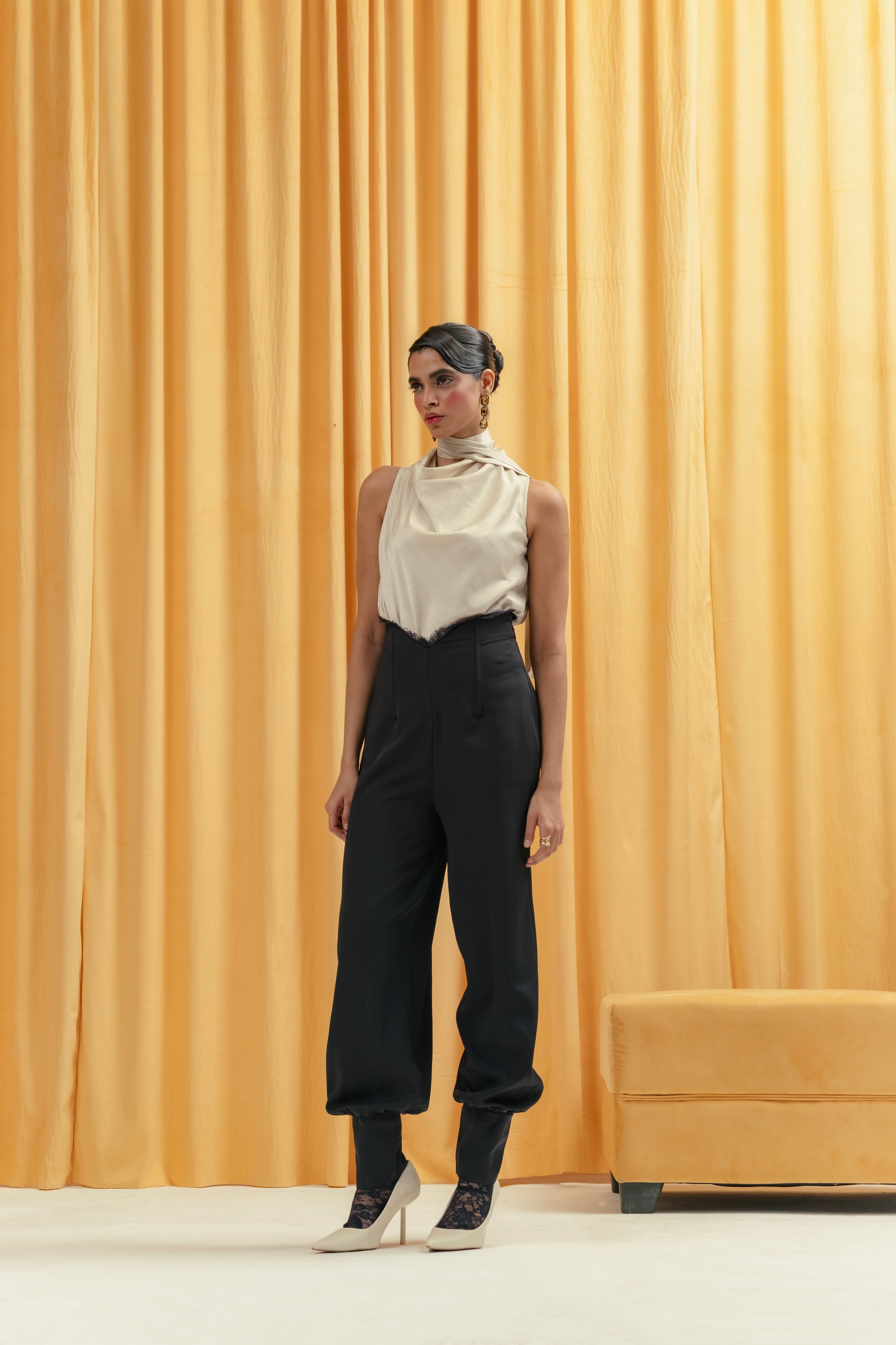 corsetted waist with pouff pants and lace detailing on waist
