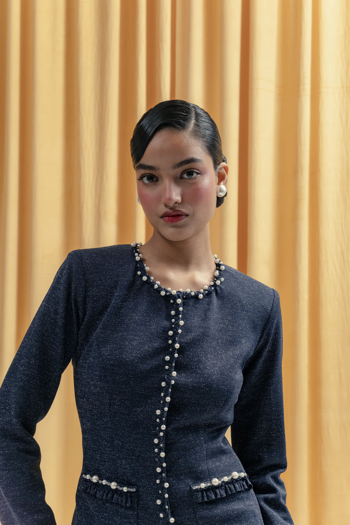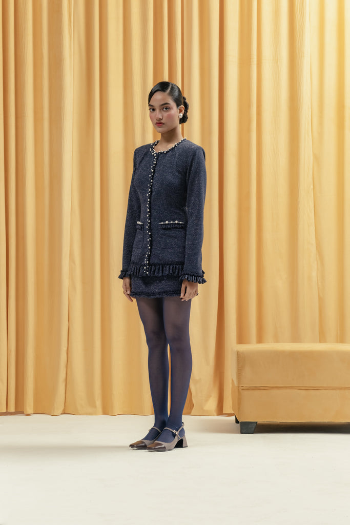 Blue knit cord set finished with full sleeves and padded shoulders, comes with a skirt. Finishing is done with pearl work