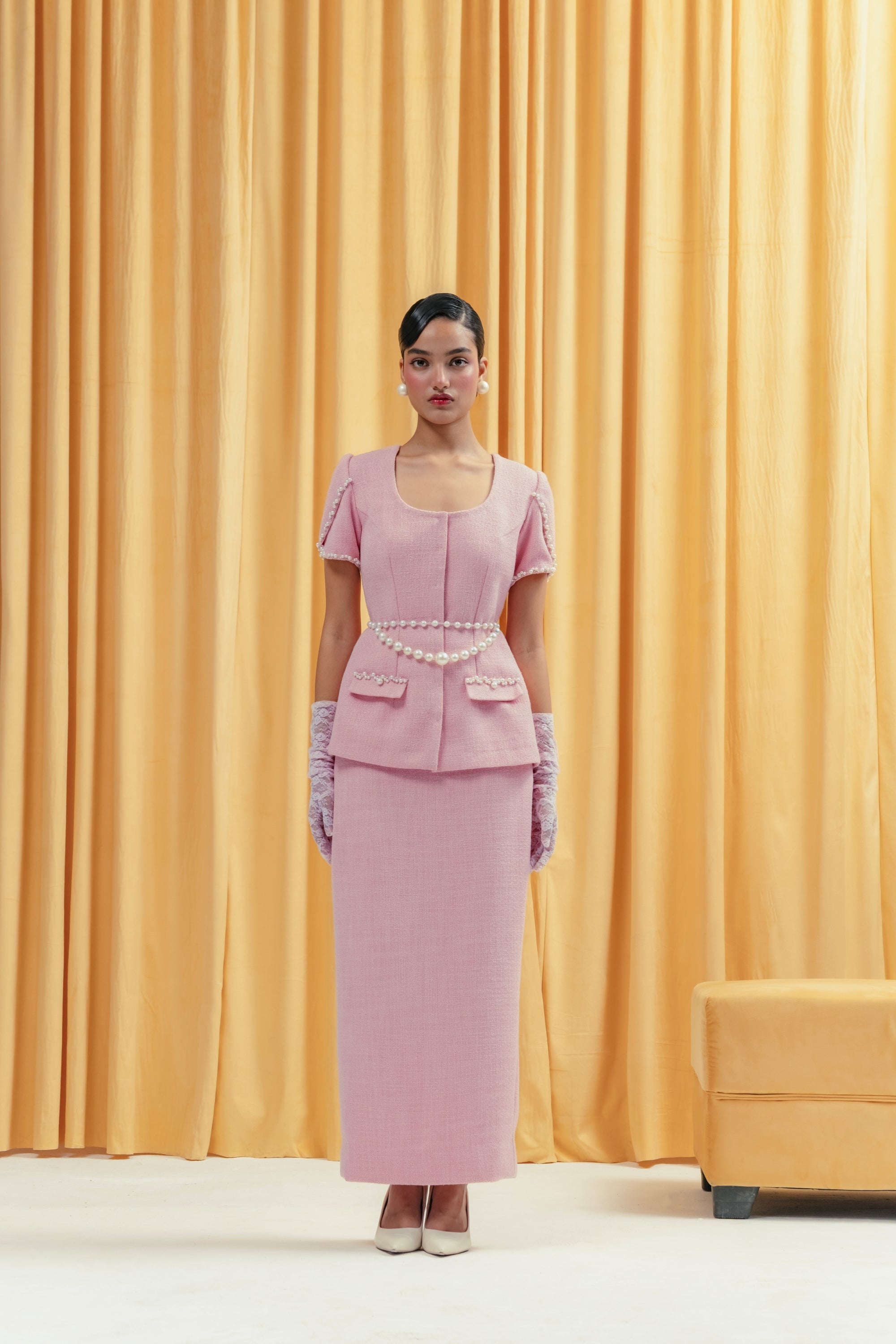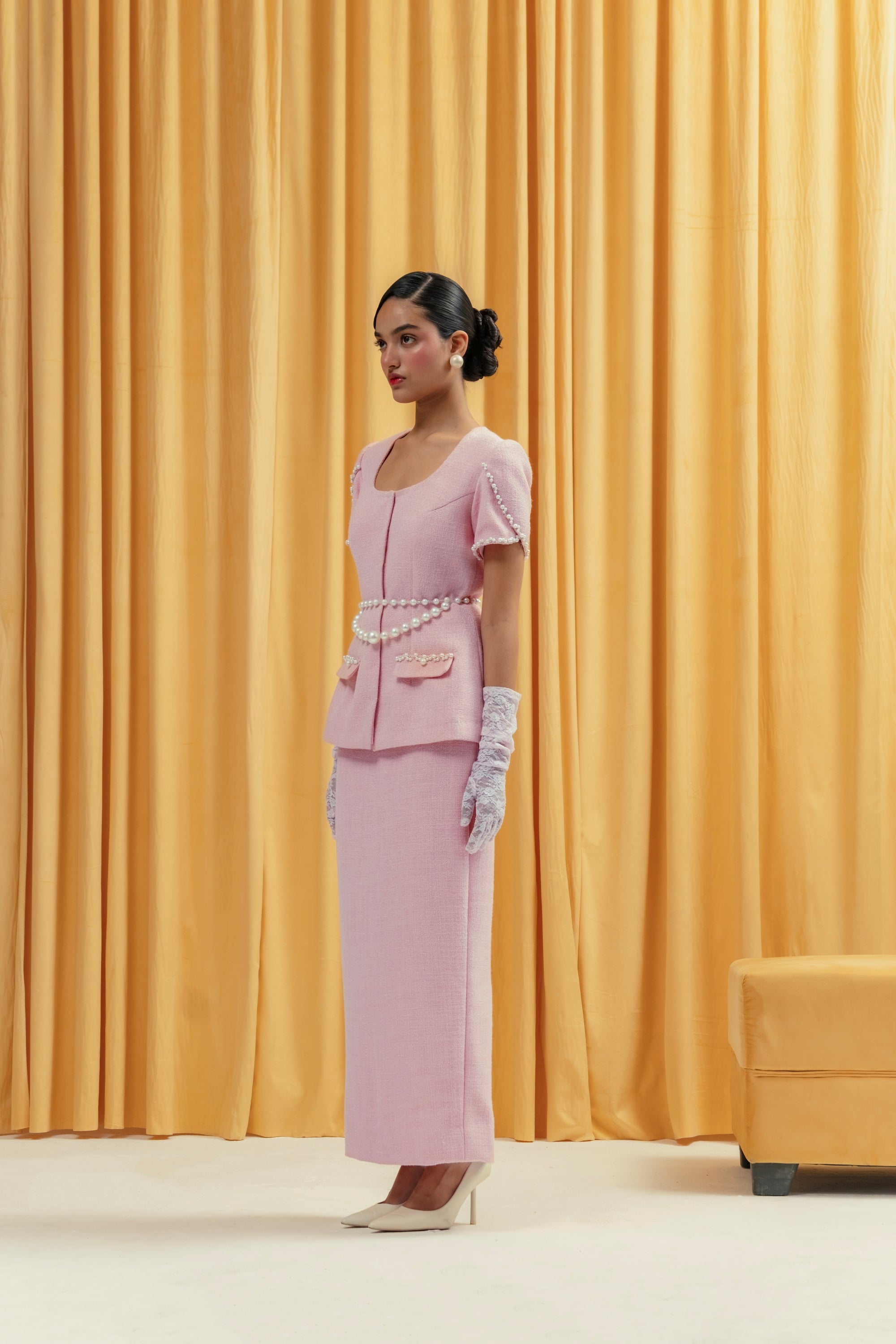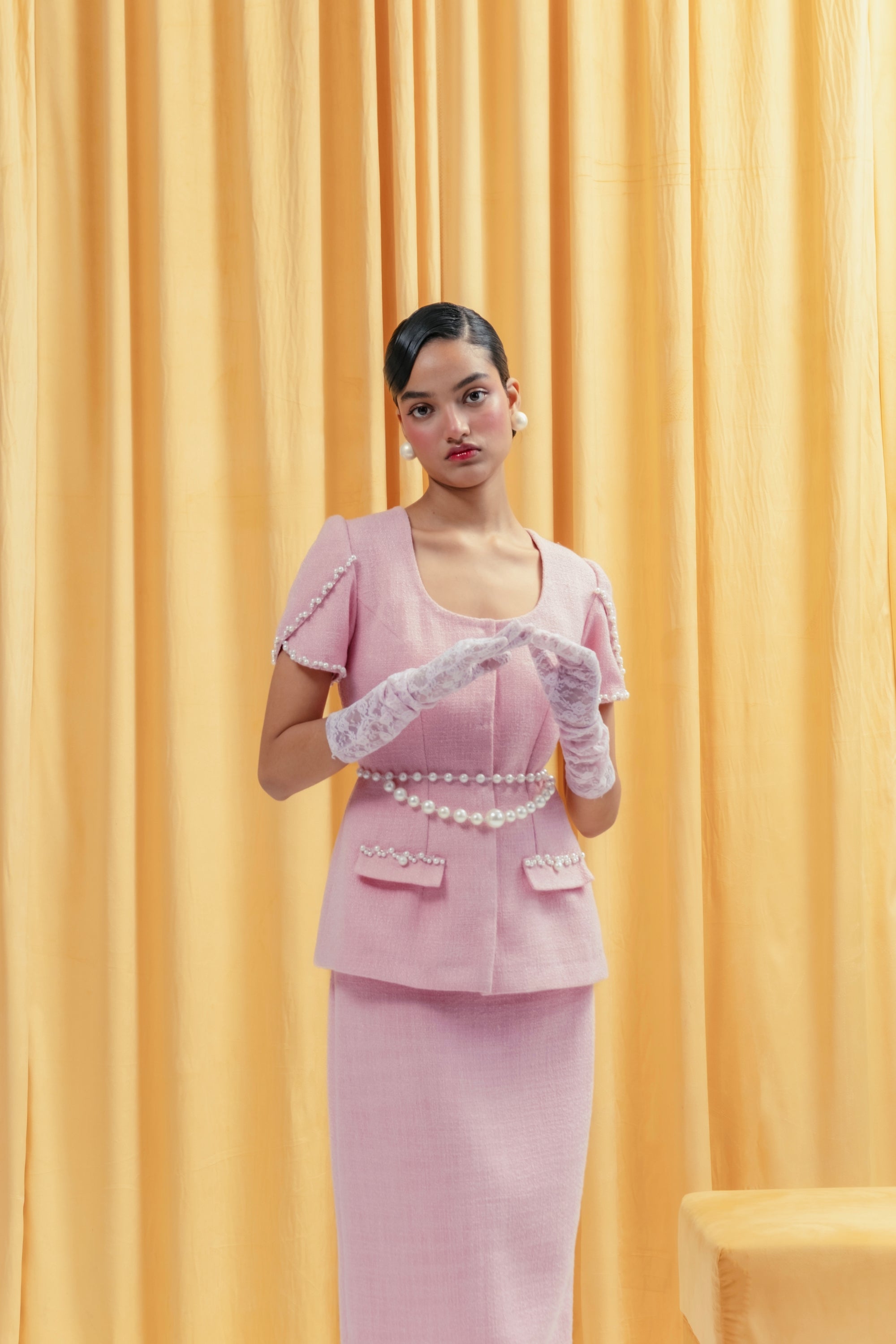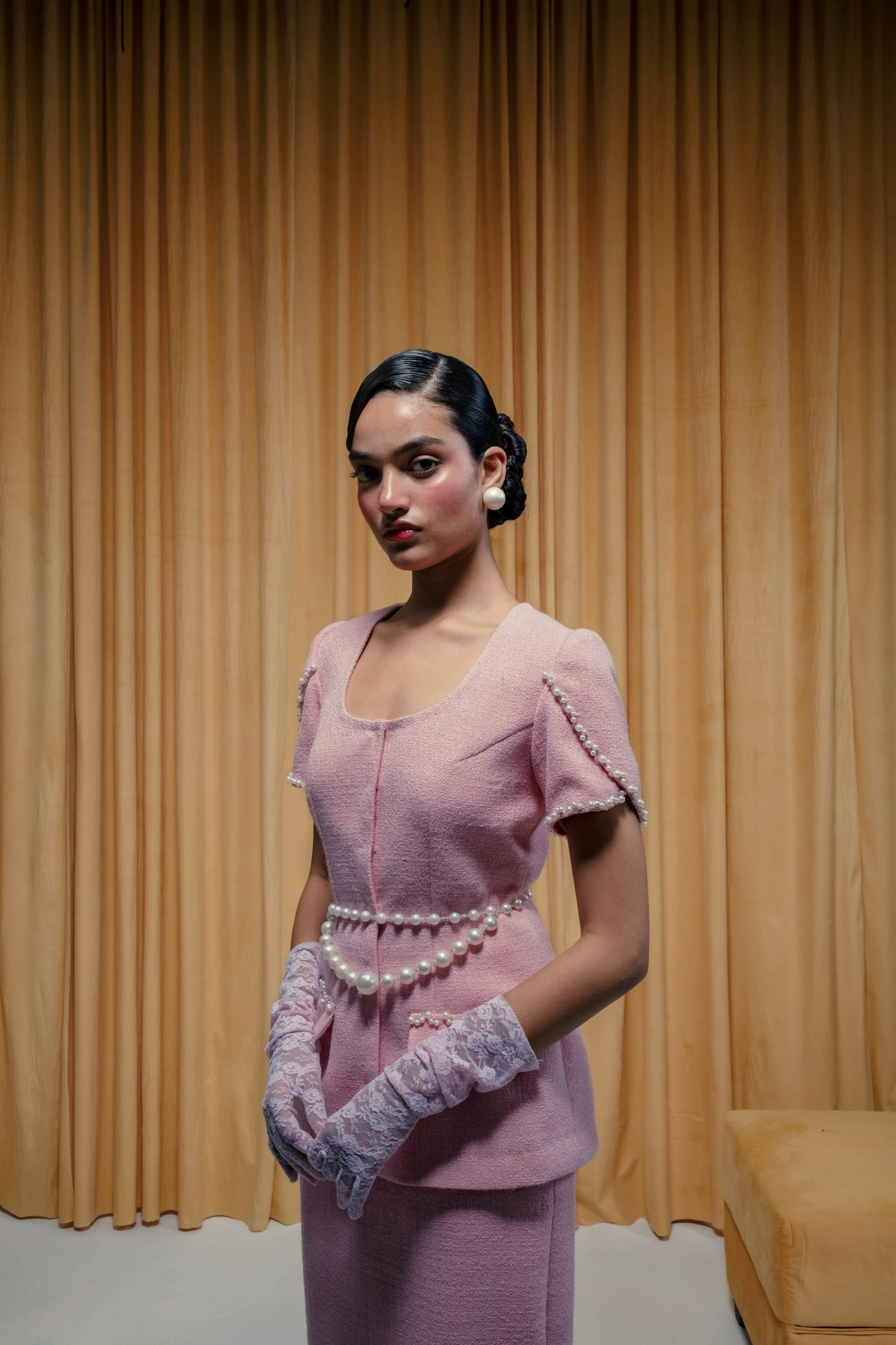 Pink tweed cord set with petal sleeves, finished with pearl embellishment on sleeves and pockets. Comes with a pearl belt